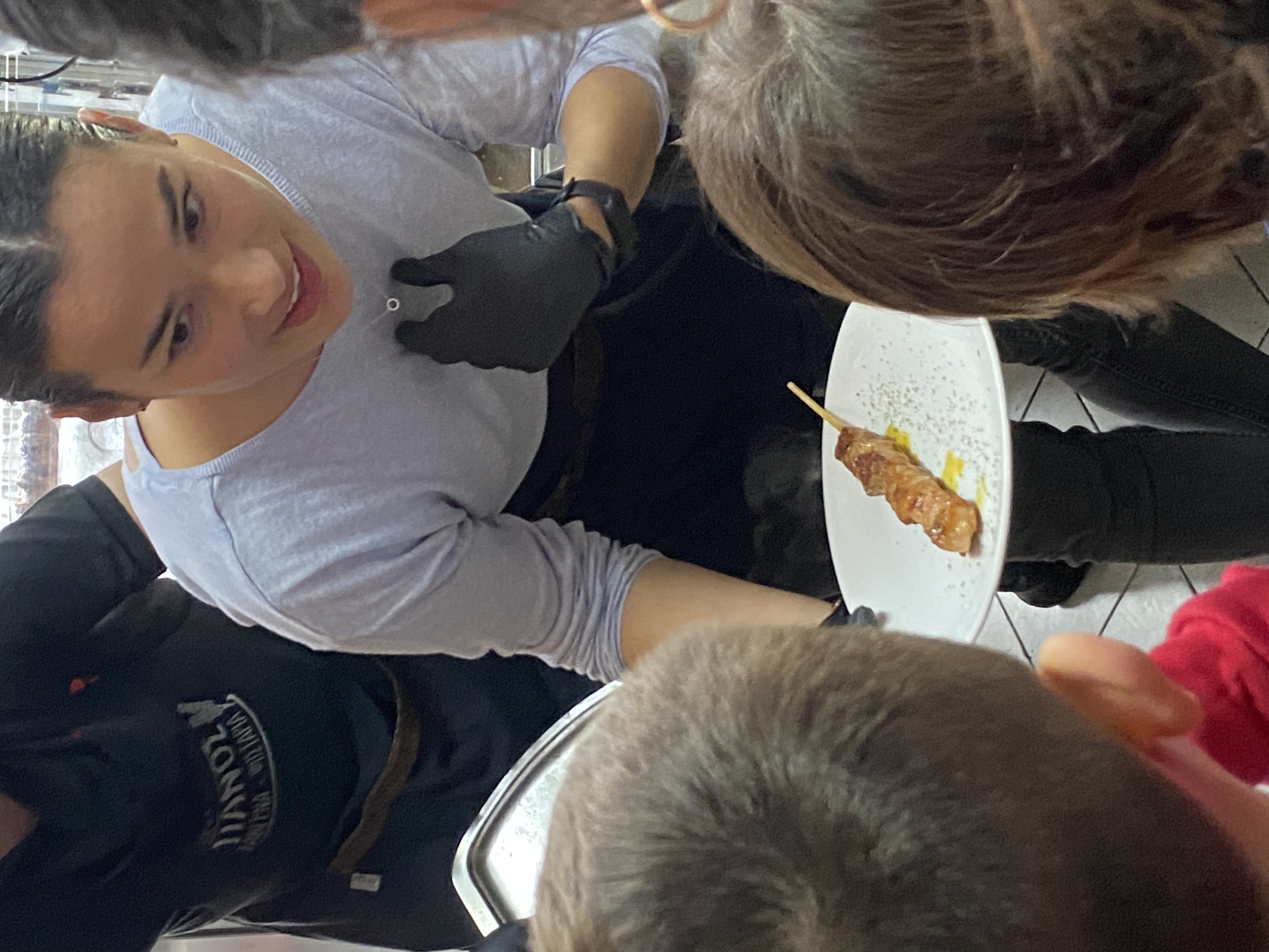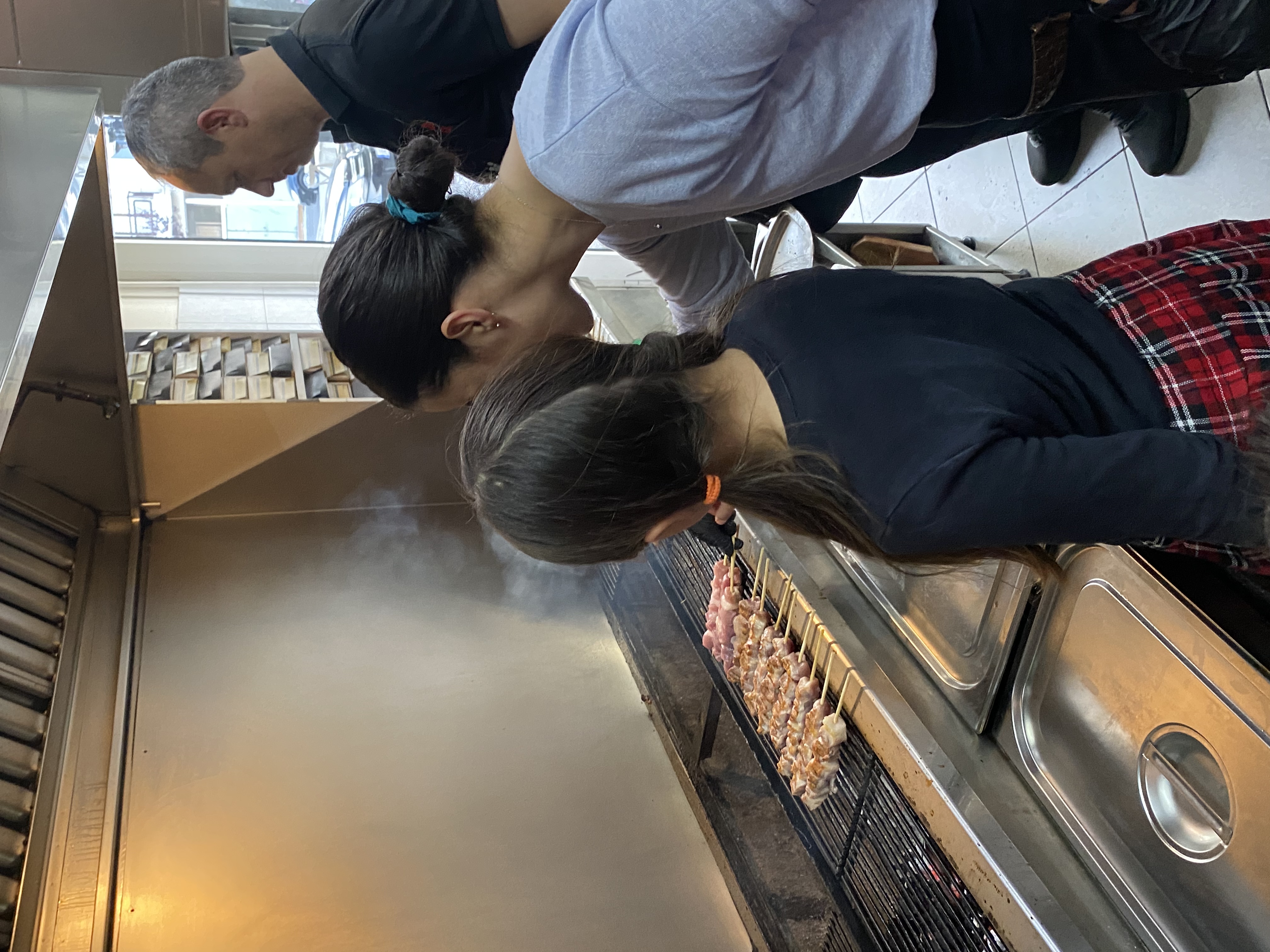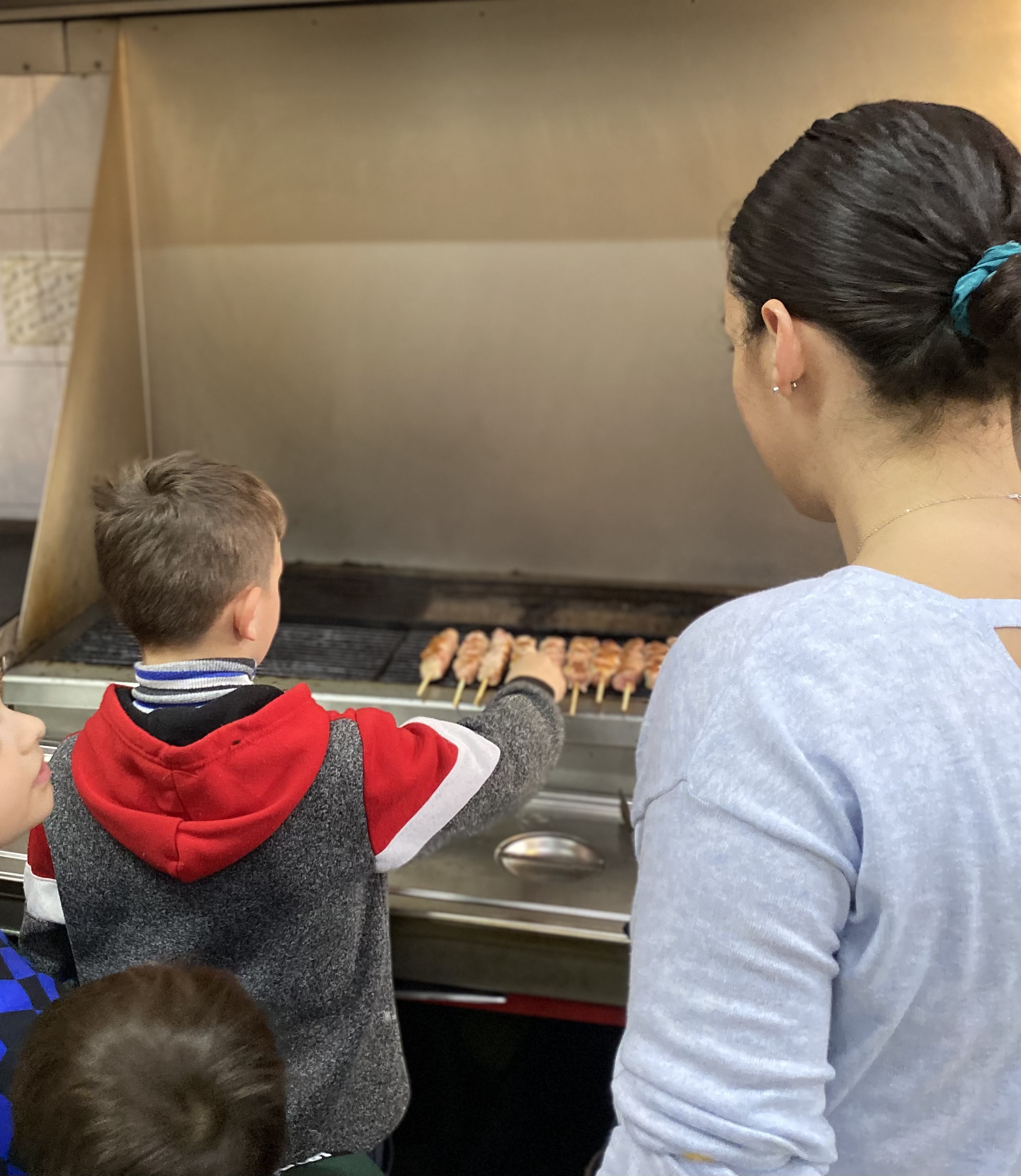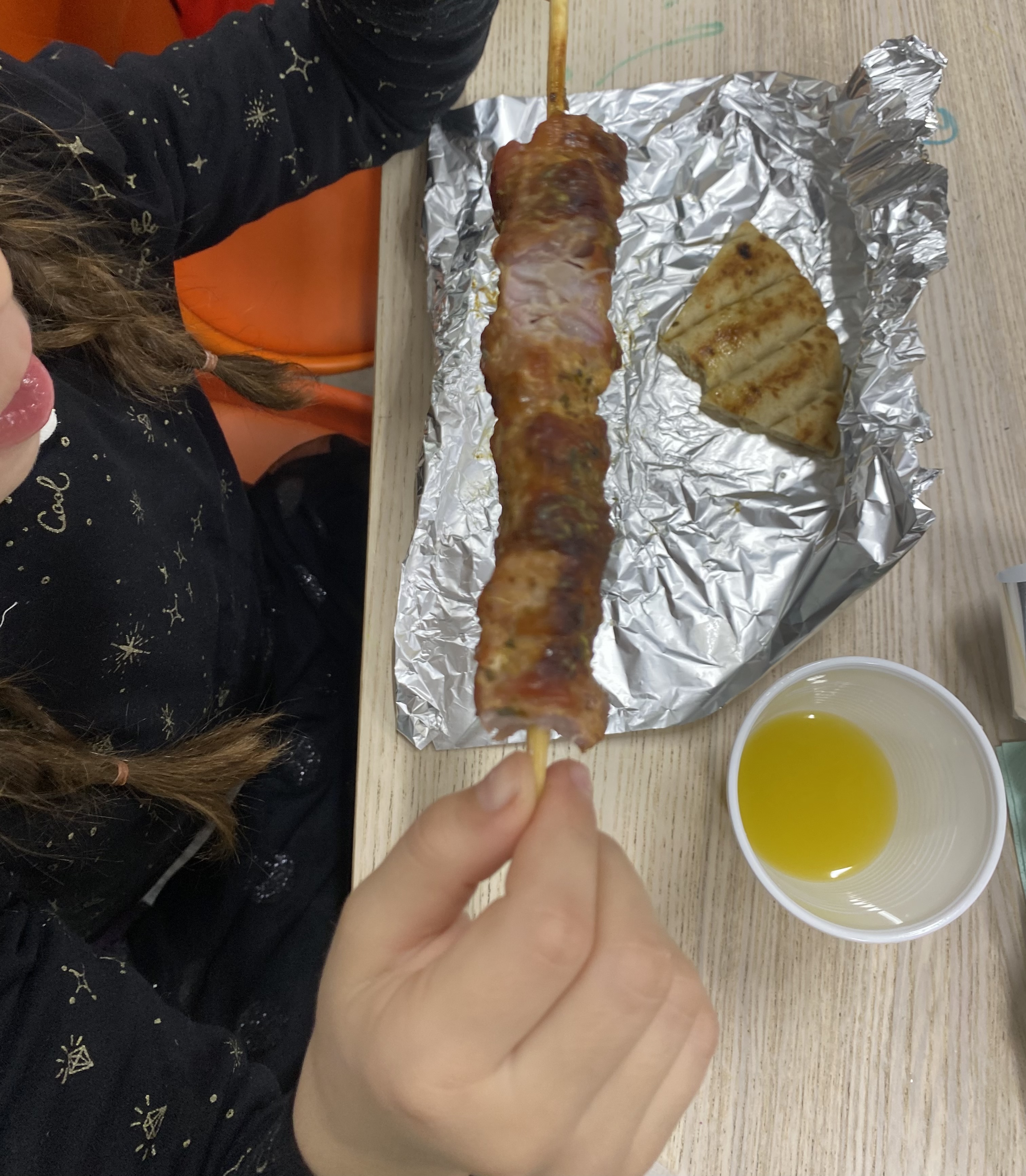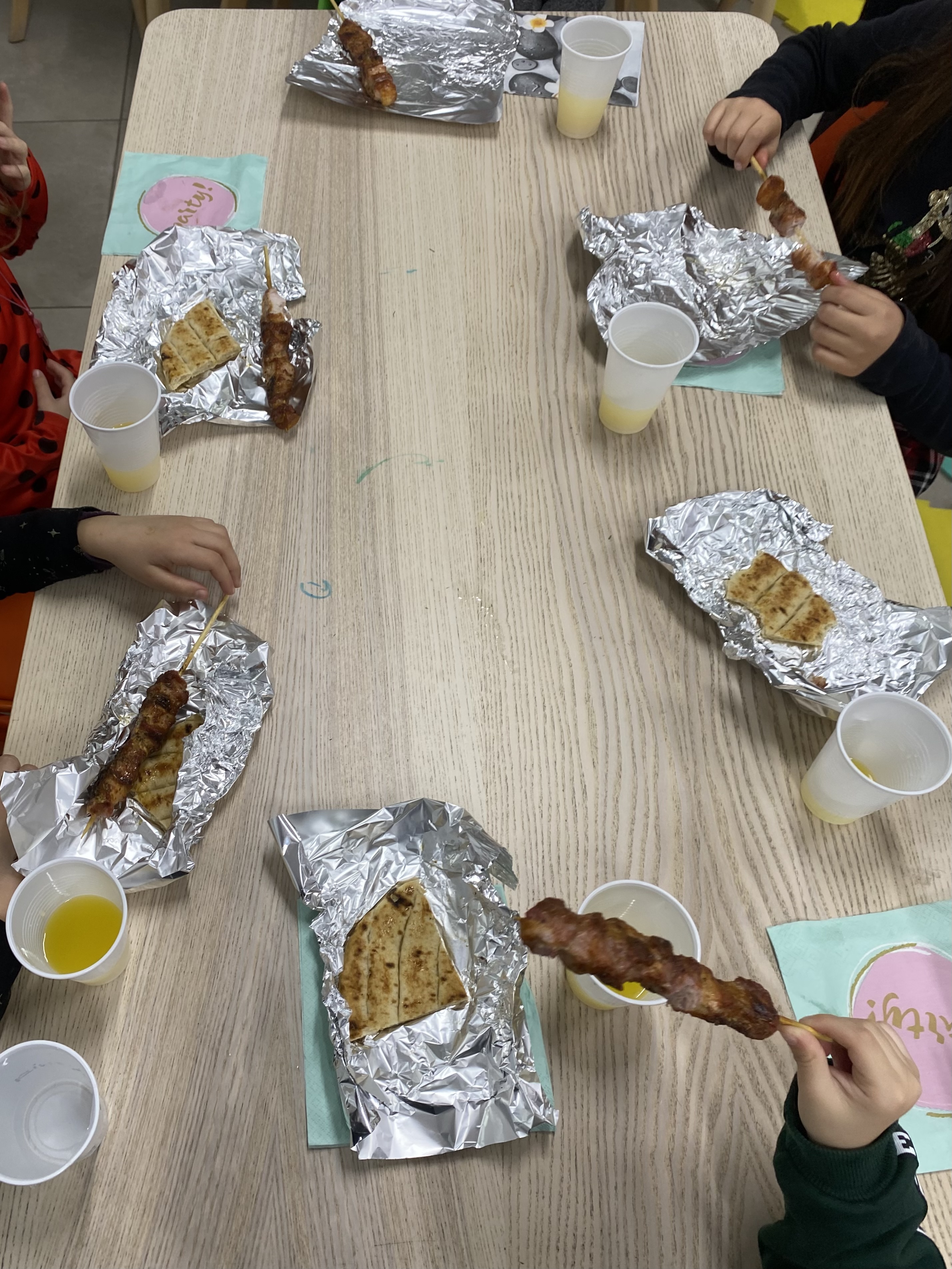 Σήμερα για τα παιδιά, η χαρά ήταν διπλή και αυτή γιατί επισκεπτήκαμε την ταβέρνα « Ο ΠΑΝΟΣ» ,μάθαμε πως γίνονται τα σουβλάκια, βοηθήσαμε στη διαδικασία και στη συνέχεια γευτήκαμε και τσικνίσαμε ο καθένας ξεχωριστά με το δικό του σουβλάκι.